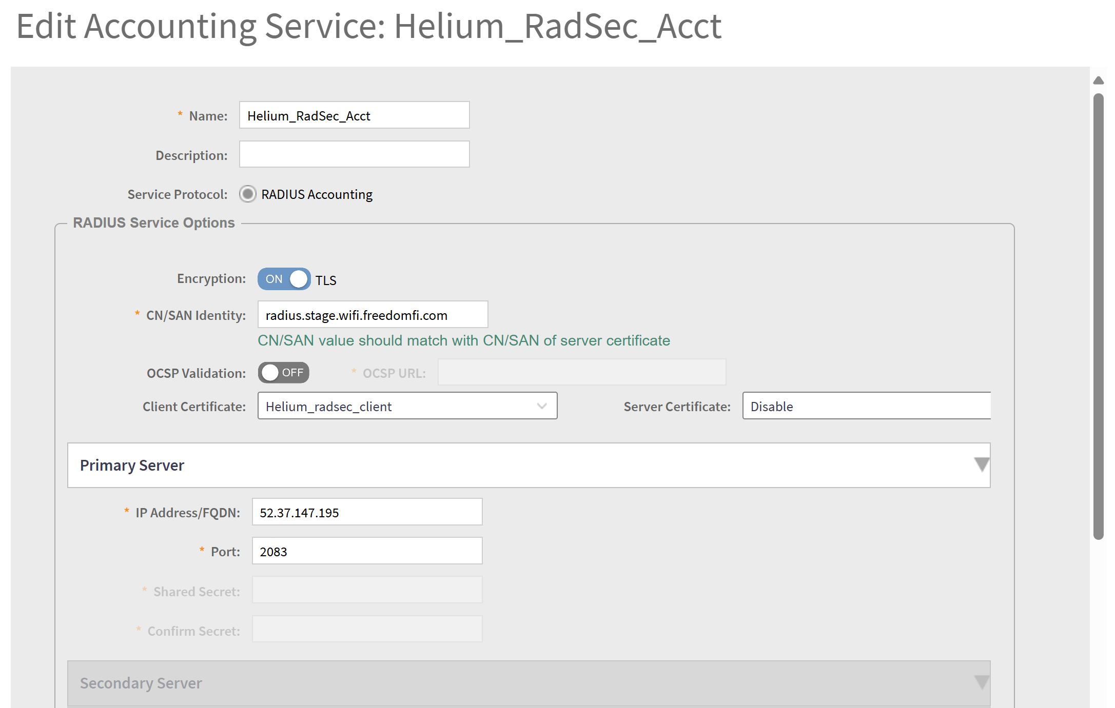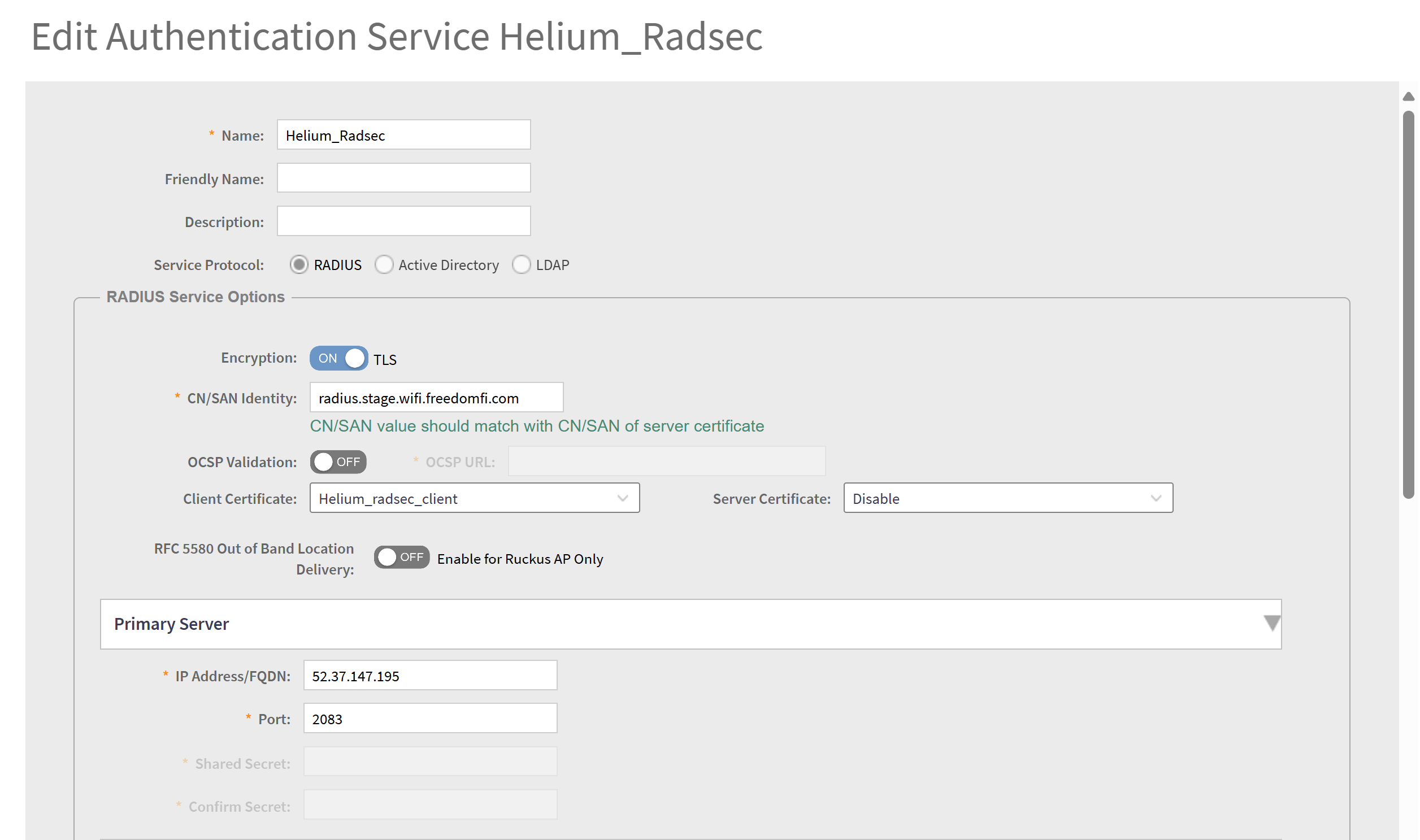 4. Enter CN/SAN Identity as radius.stage.wifi.freedomfi.com